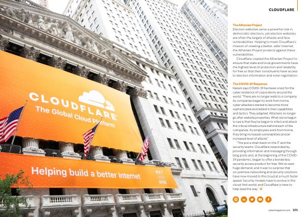 “ This put a strain back on the IT and the security teams . Cloudflare responded by providing information and messaging through blog posts and , at the beginning of the COVID- 19 pandemic , began to offer a borderless security access product for free . We ’ ve seen huge demand , and it was no surprise that on-premise networking and security solutions have now moved to the cloud at a much faster speed . Security models have to evolve in this cloud-first world , and Cloudflare is here to help lead the way ”. cybermagazine . com 101