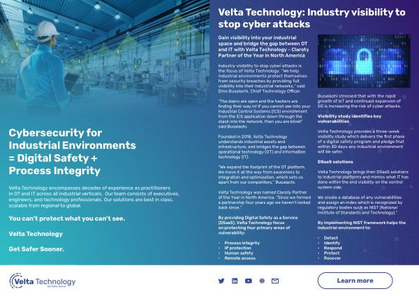 Velta Technology encompasses decades of experience as practitioners in OT and IT across all industrial verticals . Our team consists of executives , engineers , and technology professionals . Our solutions are best in class , scalable from regional to global .
