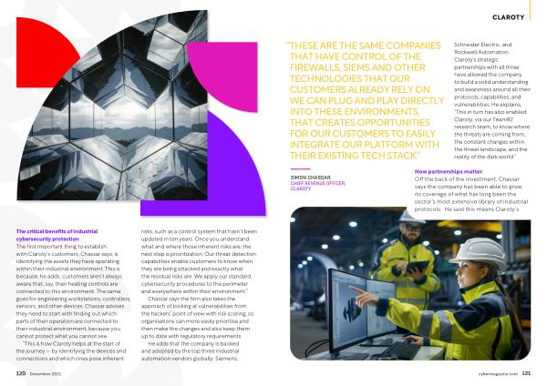Schneider Electric , and Rockwell Automation . Claroty ’ s strategic partnerships with all three have allowed the company to build a solid understanding and awareness around all their protocols , capabilities , and vulnerabilities . He explains , “ This in turn has also enabled Claroty , via our Team82 research team , to know where the threats are coming from , the constant changes within the threat landscape , and the reality of the dark world .”