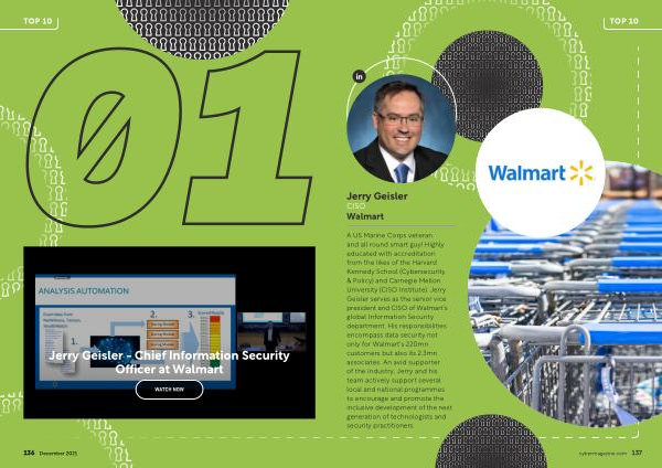 A US Marine Corps veteran and all round smart guy ! Highly educated with accreditation from the likes of the Harvard Kennedy School ( Cybersecurity & Policy ) and Carnegie Mellon University ( CISO Institute ). Jerry Geisler serves as the senior vice president and CISO of Walmart ’ s global Information Security department . His responsibilities encompass data security not only for Walmart ’ s 220mn customers but also its 2.3mn associates . An avid supporter of the industry , Jerry and his team actively support several local and national programmes to encourage and promote the inclusive development of the next generation of technologists and security practitioners .