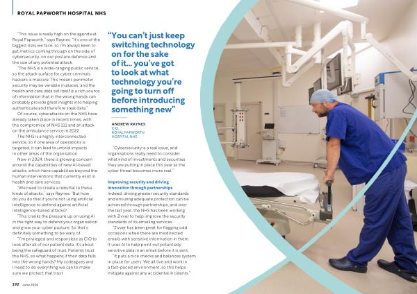 “ This issue is really high on the agenda at Royal Papworth ,” says Raynes . “ It ’ s one of the biggest risks we face , so I ’ m always keen to get metrics coming through on the side of cybersecurity , on our posture defence and the size of any potential attack .