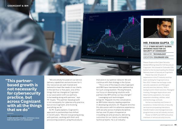 Pawan Gupta is the Cyber Security Global Offering Head for CIS Security at Cognizant . He is based in Colorado USA . Earlier to this he was heading the Global Delivery team of Security at Cognizant .