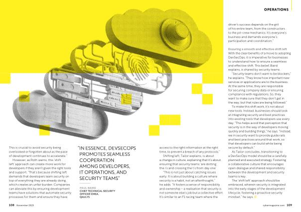 “ This is not just about catching issues early . It is about building a culture where security is a habit , not an afterthought ,” he adds . “ It fosters a sense of responsibility and ownership – a realisation that security is not someone else ’ s job but a collective effort . It ’ s similar to an F1 racing team where the