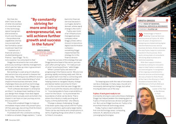 With their support , Krista is constantly looking for innovative ways to help Fujitsu ’ s customers succeed and grow . In recognition of her ongoing commitment to financial services and technology , she was a finalist for Role Model of the Year in the Women in Tech Excellence Awards 2022 , Top 100 Women in FinTech 2022 and