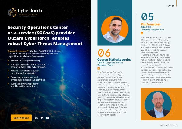 Vice President of Corporate Information Security at Apple , George Stathakopoulos is an experienced executive with a demonstrated history of working in the consumer electronics industry . Skilled in scalability , enterprise software , culture change , online services , and vulnerability assessment , he is a strong military and protective services professional with a Bachelor ’ s degree focused in Computer Science from Portland State University .