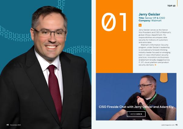 Title : Senior VP & CISO Company : Walmart Jerry Geisler serves as the Senior Vice President and CISO of Walmart ’ s global infosec department . His responsibilities encompass data security for millions of customers and associates .