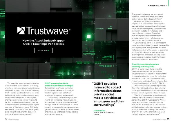 “ OSINT is a key practice in any modern cybersecurity strategy , alongside vulnerability testing and patch management ,” he adds . “ All practices that whilst unable to guarantee 100 % security all of the time , given the evolving threat landscape , do help keep businesses up to date with all the threats and tools to protect from them .”